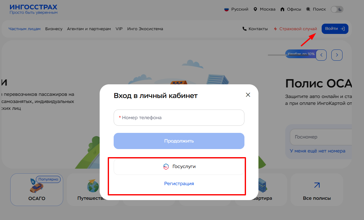 Для авторизации в ЛК Ингосстраха используйте вход через Госуслуги страхователя или по номеру телефона. Если войти не получается — зарегистрируйте личный кабинет самостоятельно по данным страхователя.
