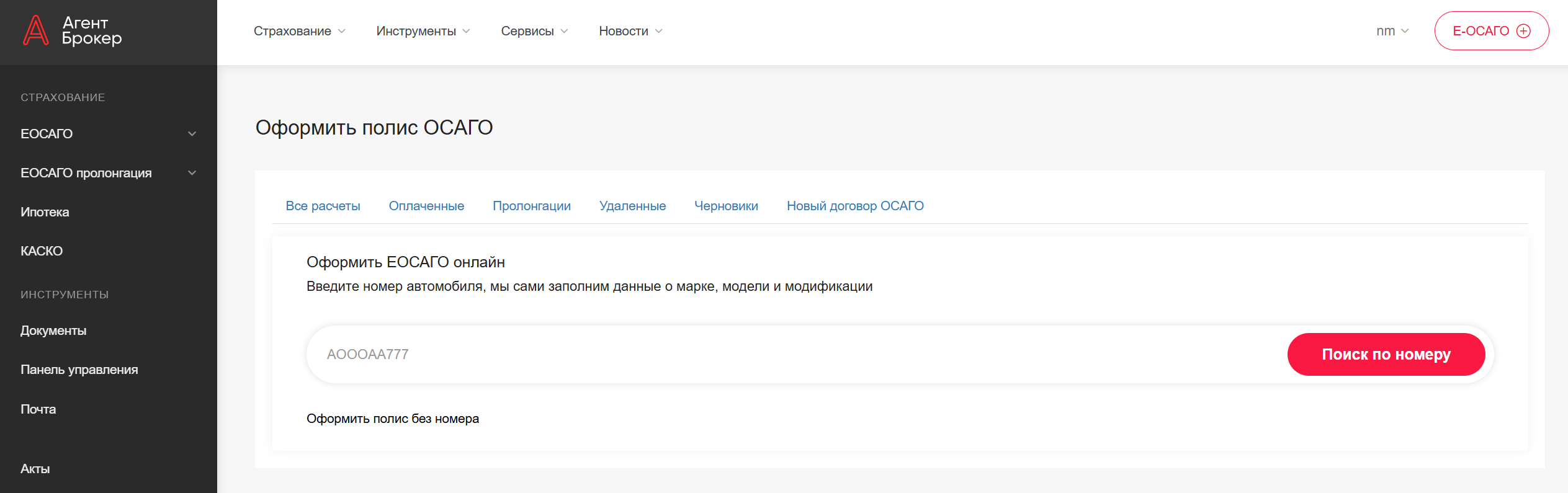 ! Если полис не поступил в течение 20 минут — обратитесь в чат поддержки или напишите на sergey@agentbroker.ru! Все расчёты, дошедшие до второго этапа, автоматически сохраняются в черновиках. Найти их можно в разделе "Все полисы"