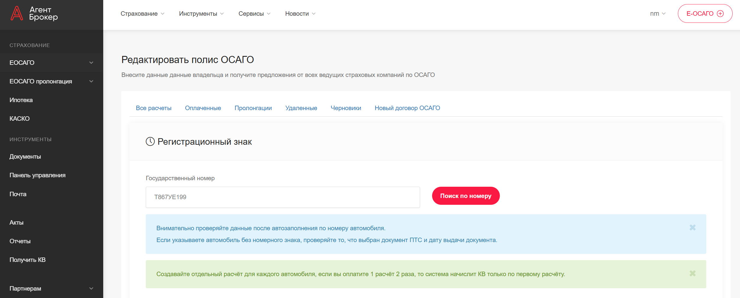На платформе АгентБрокер предусмотрена удобная функция автозаполнения — вы можете найти данные об автомобиле, просто введя его государственный номер.