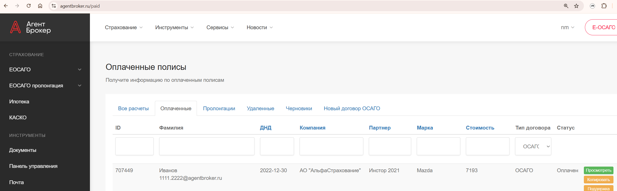 Перейдите на сайт страховой компании и нажмите «Восстановить пароль» или «Забыли пароль». В поле для email укажите адрес, сгенерированный на 3-м шаге договора (раздел «Оплата»), оканчивающийся на ...@agentbroker.ru. Этот адрес можно найти в разделе «Оплаченные полисы».