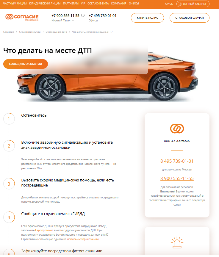 Подробный порядок действий при дорожно-транспортном происшествии описан на сайте Согласие: https://www.soglasie.ru/insurance/auto/chto-delat-esli-proizoshlo-dtp/